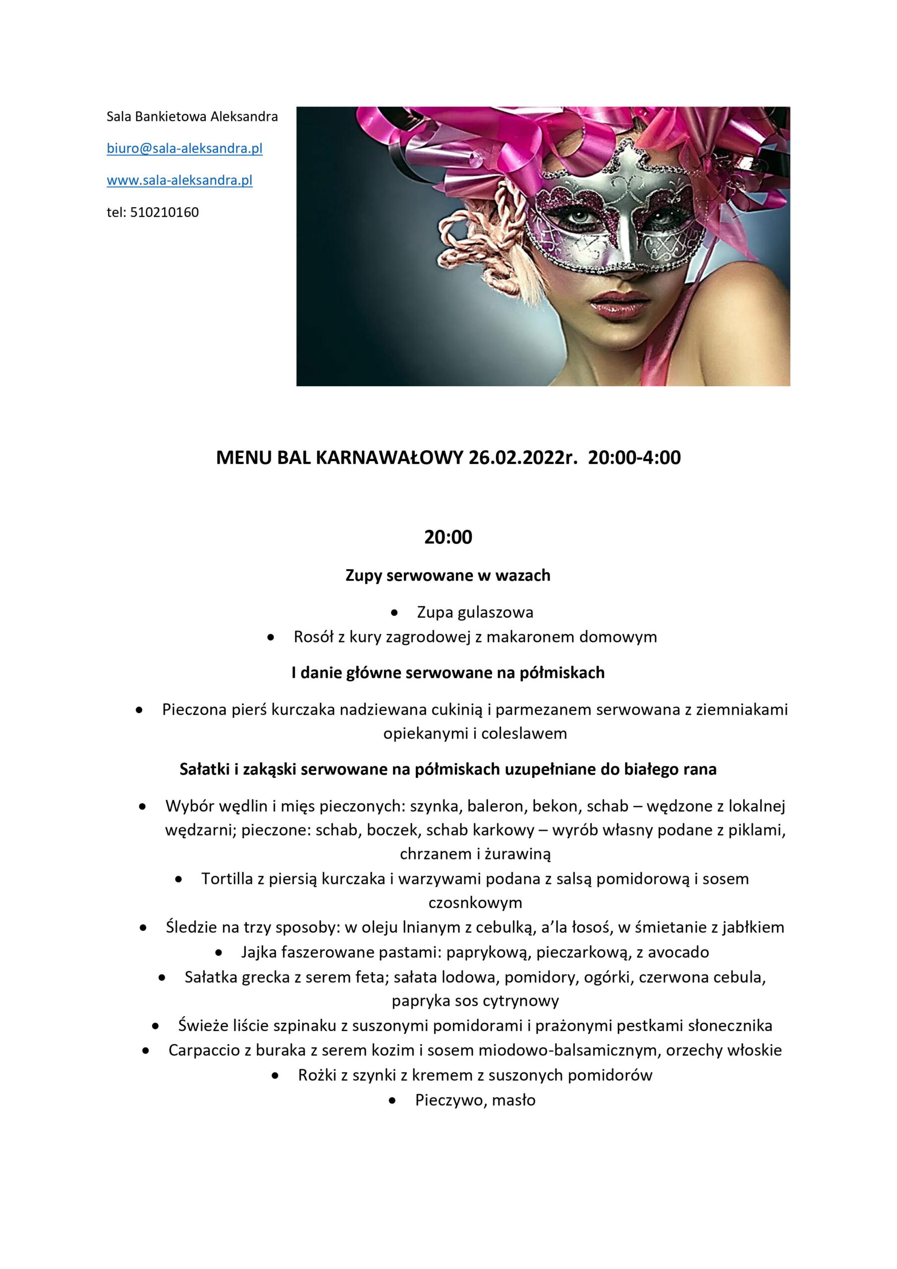 Jak co roku Sala Bankietowa Aleksandra ma ogromny zaszczyt zaprosić Państwa na niezapomnianą zabawę karnawałową. Zachęcamy do rezerwacji uczestnictwa. Zapewniamy moc atrakcji i zabawę do białego rana!